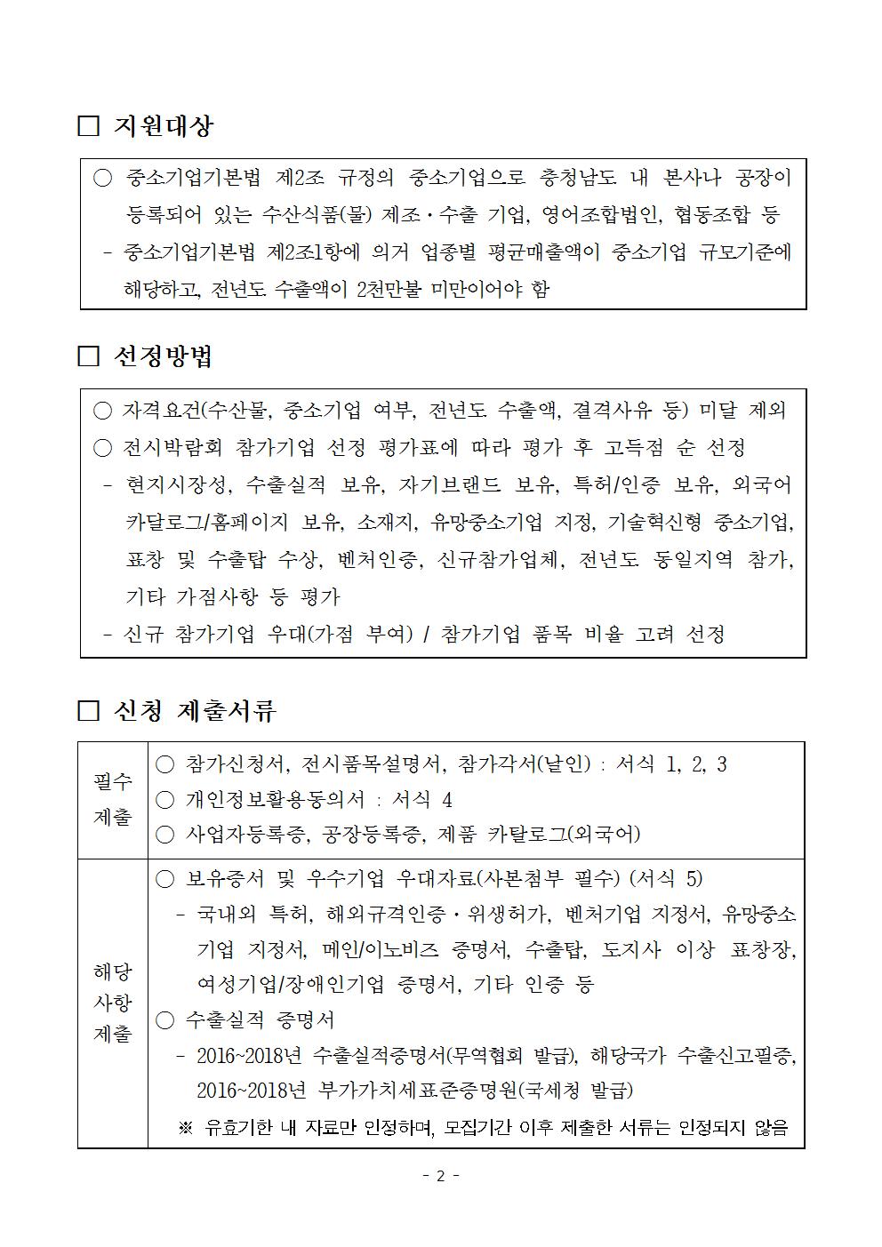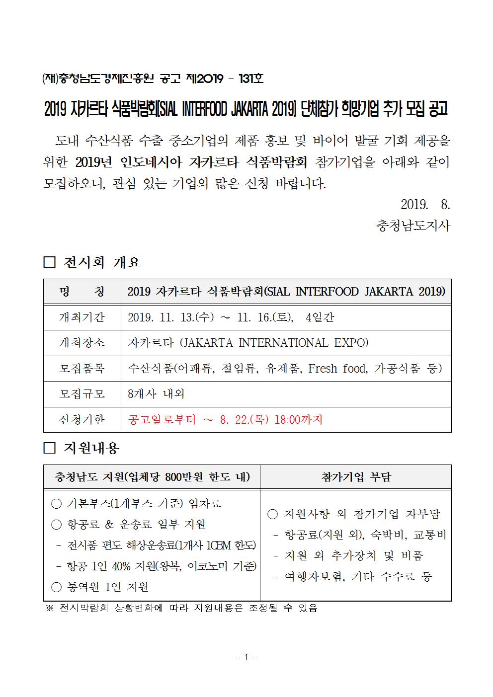 | 2019 자카르타 식품박람회 단체참가 희망기업 추가 모집 공고 |