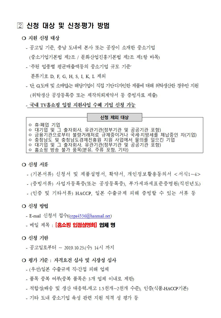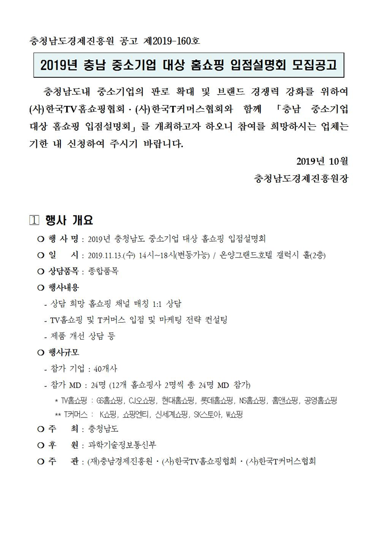 | 2019년 충남 중소기업 대상 홈쇼핑 입점설명회 모집공고 |