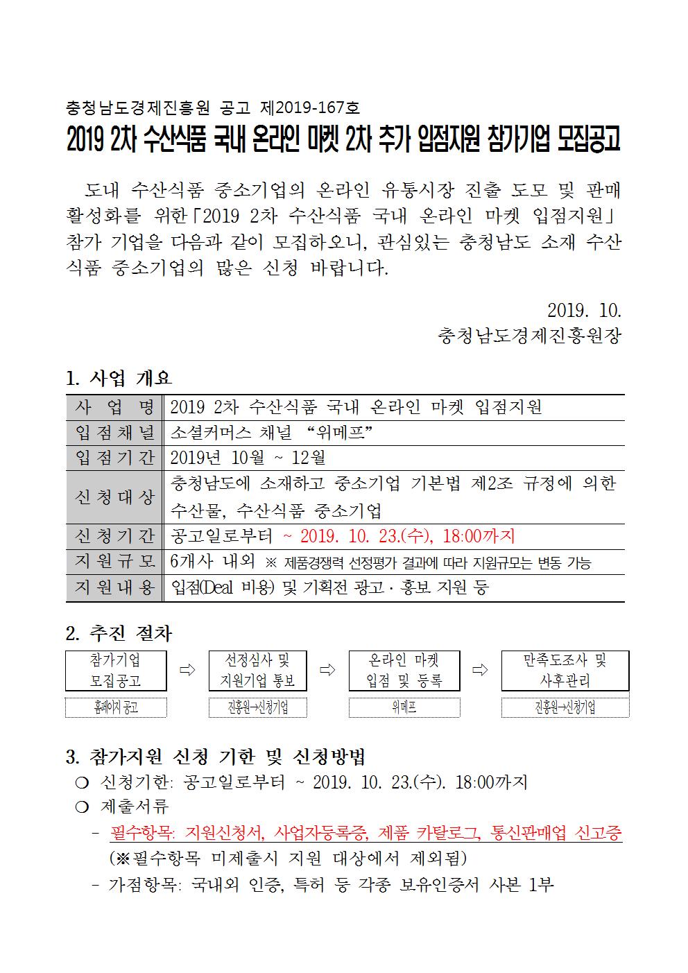 | 2019년 2차 수산식품 국내 온라인 마켓(위메프)입점지원 모집공고 |