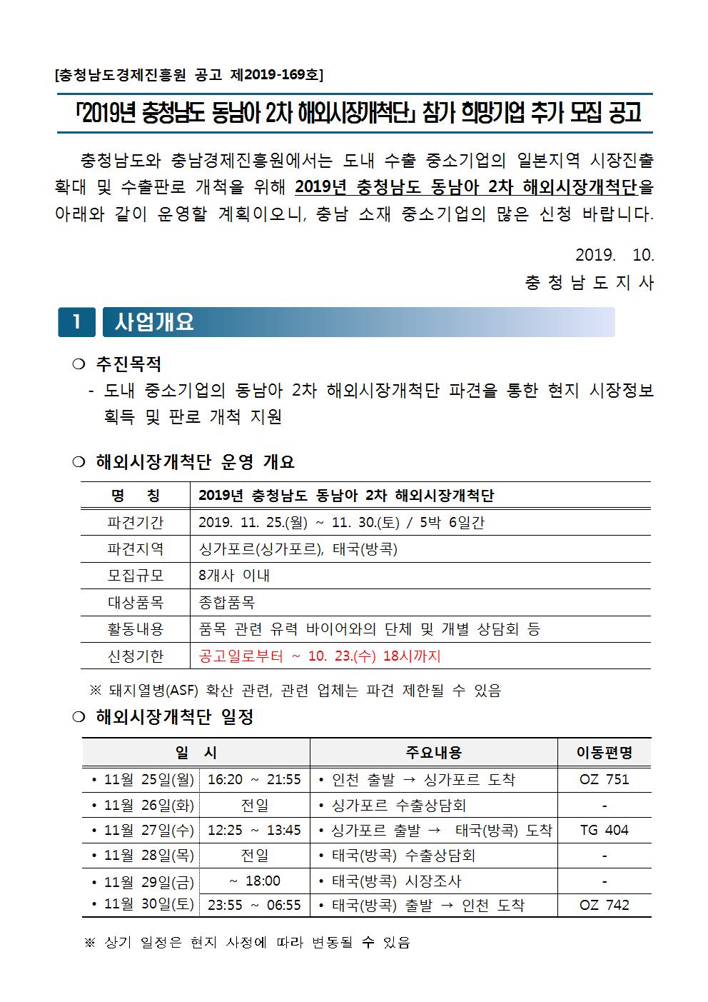 | 2019년 충청남도 동남아 2차 해외시장개척단 참가 희망기업 추가 모집 공고 |
