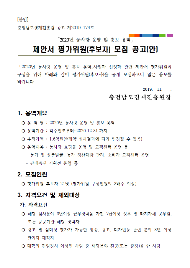 | 「2020년 농사랑 운영 및 홍보 용역」제안서 평가위원(후보자) 모집 공고 |