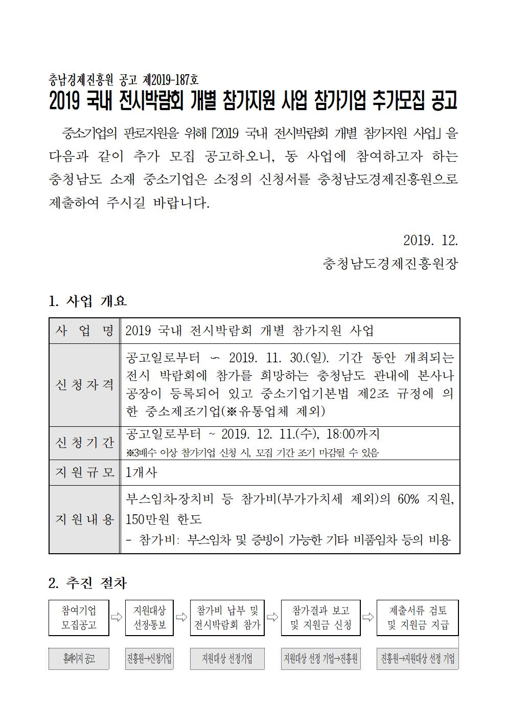 | 2019 국내 전시박람회 개별 참가지원 사업 참가기업 추가모집 |