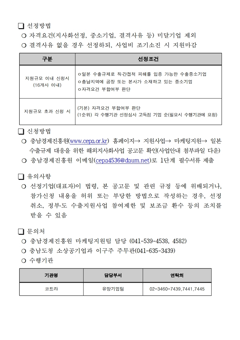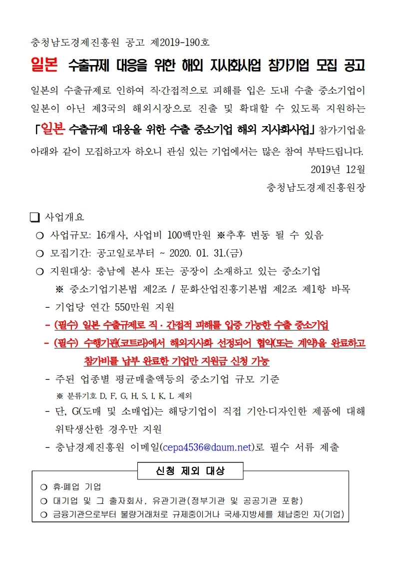 | 일본 수출규제 대응을 위한 수출 중소기업 해외지사화 참가기업 모집공고 |