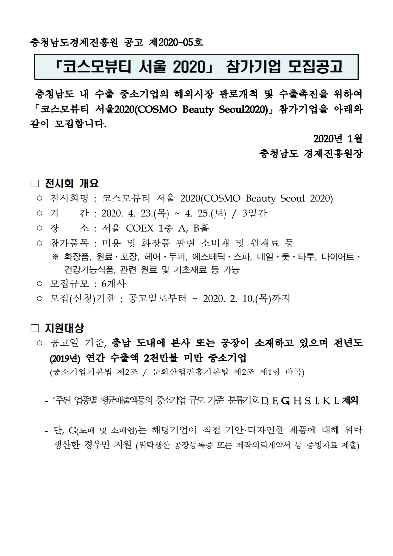 | 「코스모뷰티 서울2020(COSMO Beauty Seoul2020)」단체참가 기업모집 공고 |