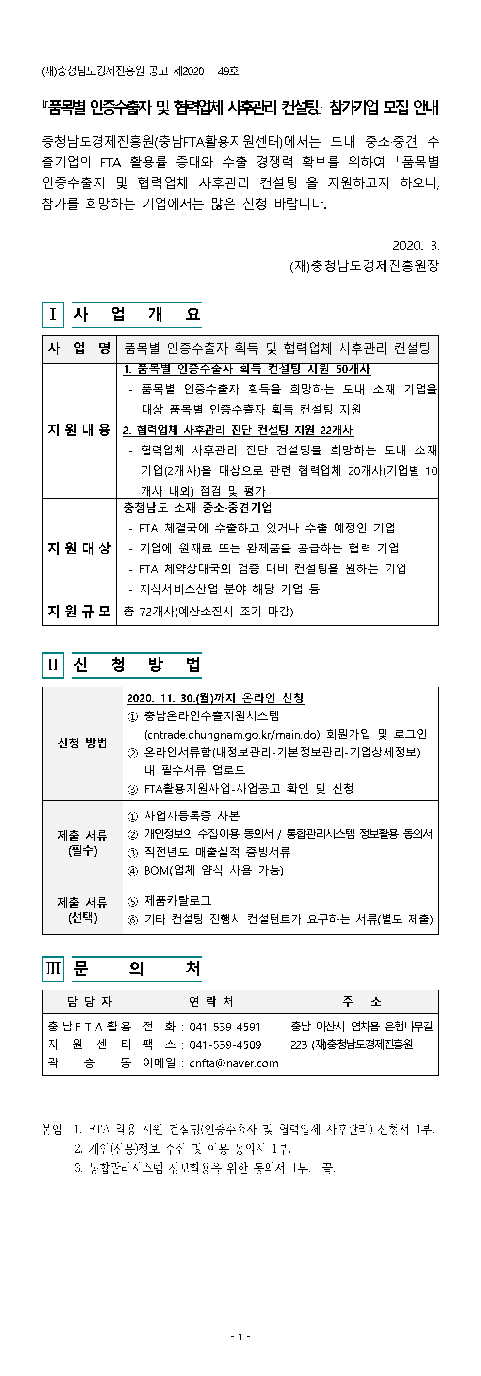 | 2020년 품목별 인증수출자 및 협력업체 사후관리 컨설팅 참가기업 모집공고 |