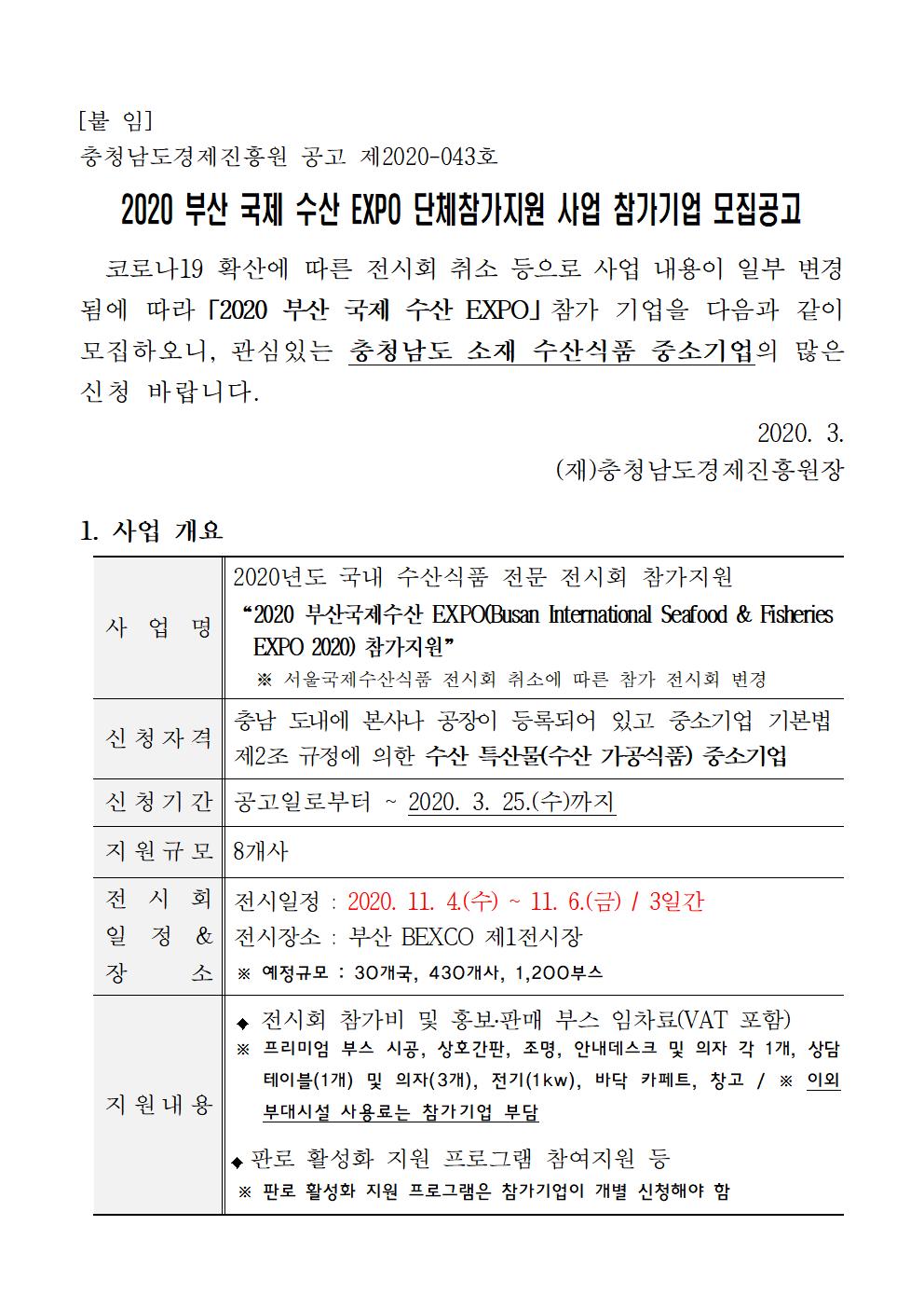 | [수산식품 기업 대상] 2020년 부산 국제 수산 엑스포 단체참가지원 사업 참가기업 모집 |