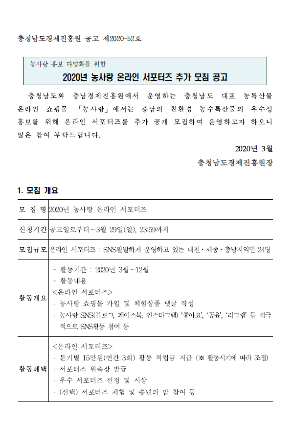 | 2020년 농사랑 온라인 서포터즈 추가 모집 공고 |