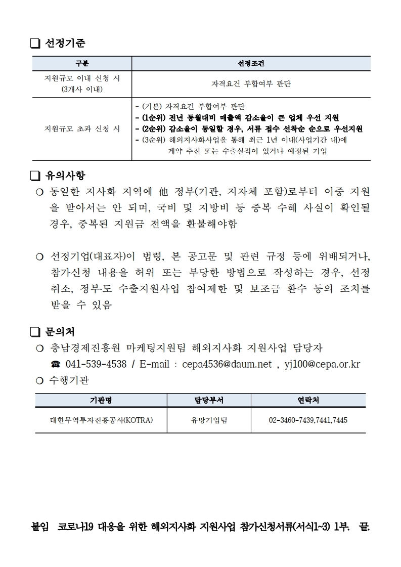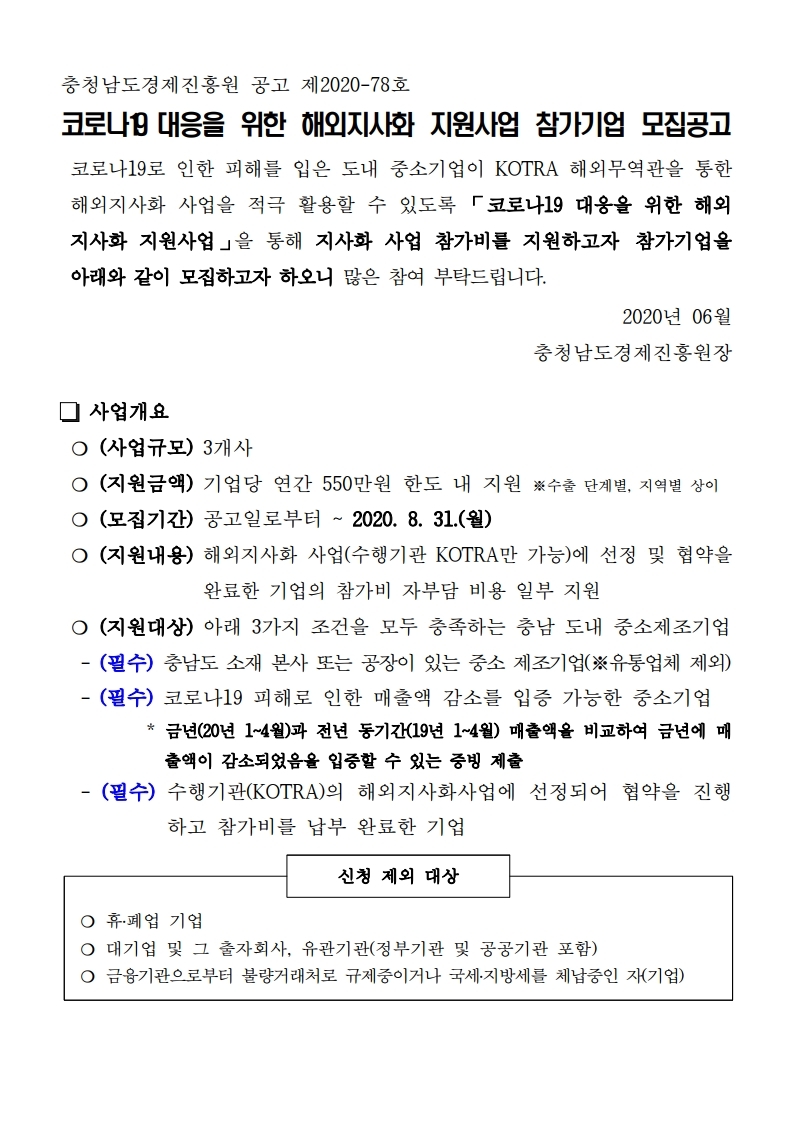 | 2020년 코로나19 대응을 위한 해외지사화 지원사업 참가기업 모집공고 |