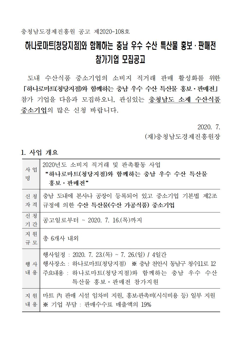 | [수산식품 기업 대상] 하나로마트(청당지점)와 함께하는 충남 우수 수산 특산물 홍보 판매전 참가기업 모집 |
