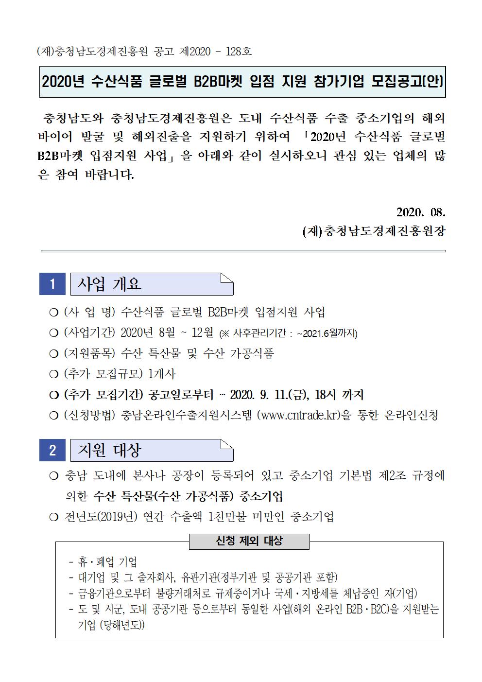 | 2020년 수산식품 글로벌 B2B마켓 입점 지원사업 참가기업 추가모집 |