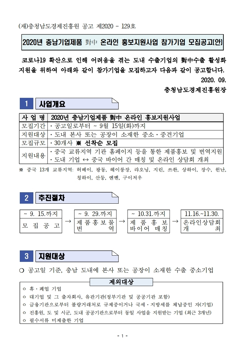 | 2020년 충남기업제품 對中 온라인 홍보지원사업 참가기업 모집공고 |