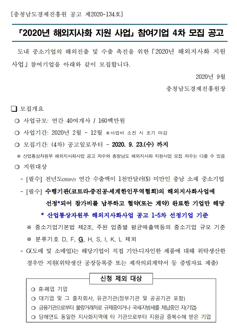 | 2020년 해외지사화 지원 사업 참여기업 4차 모집 공고 |
