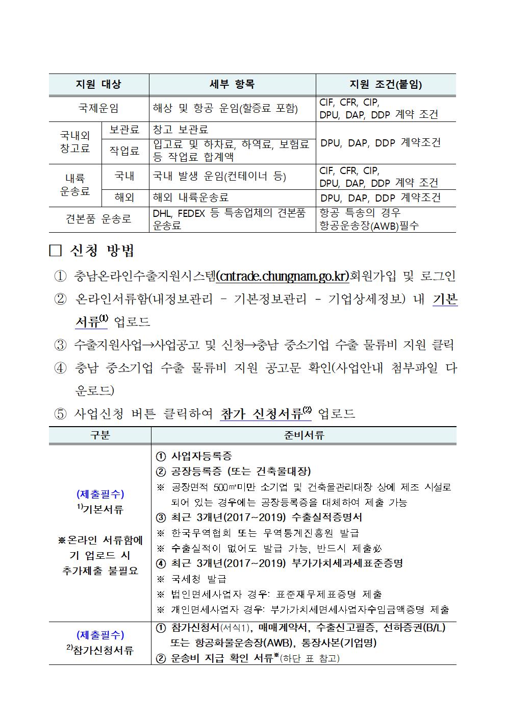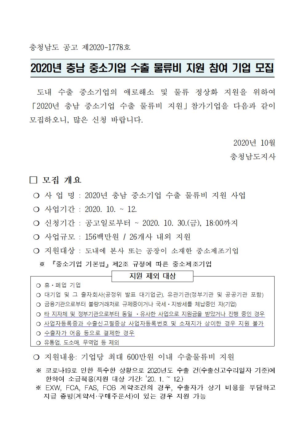 | 2020 충남 중소기업 수출 물류비 지원 참여 기업 모집 |