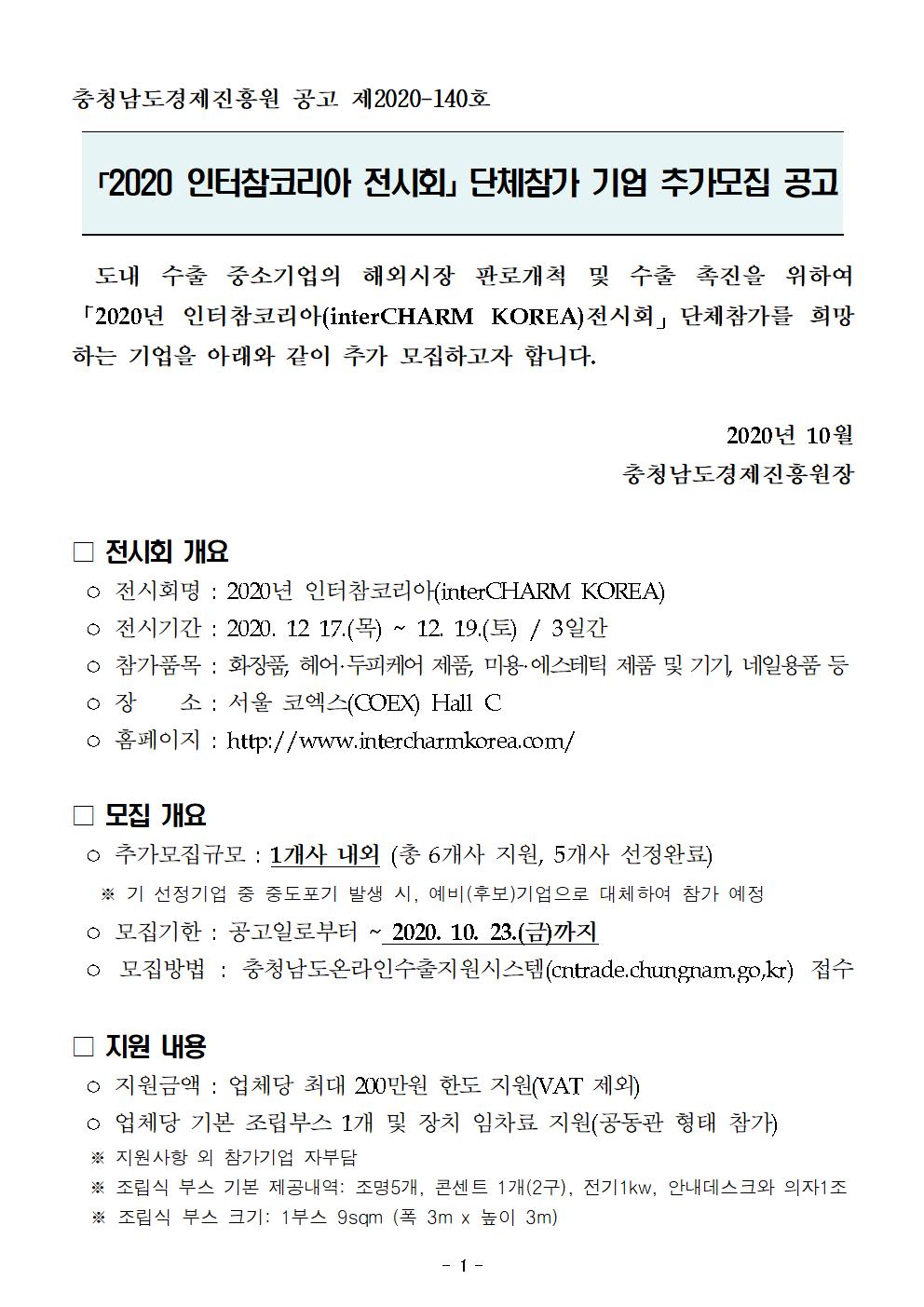 | 2020년 인터참코리아 전시회 단체참가기업 추가모집공고 |
