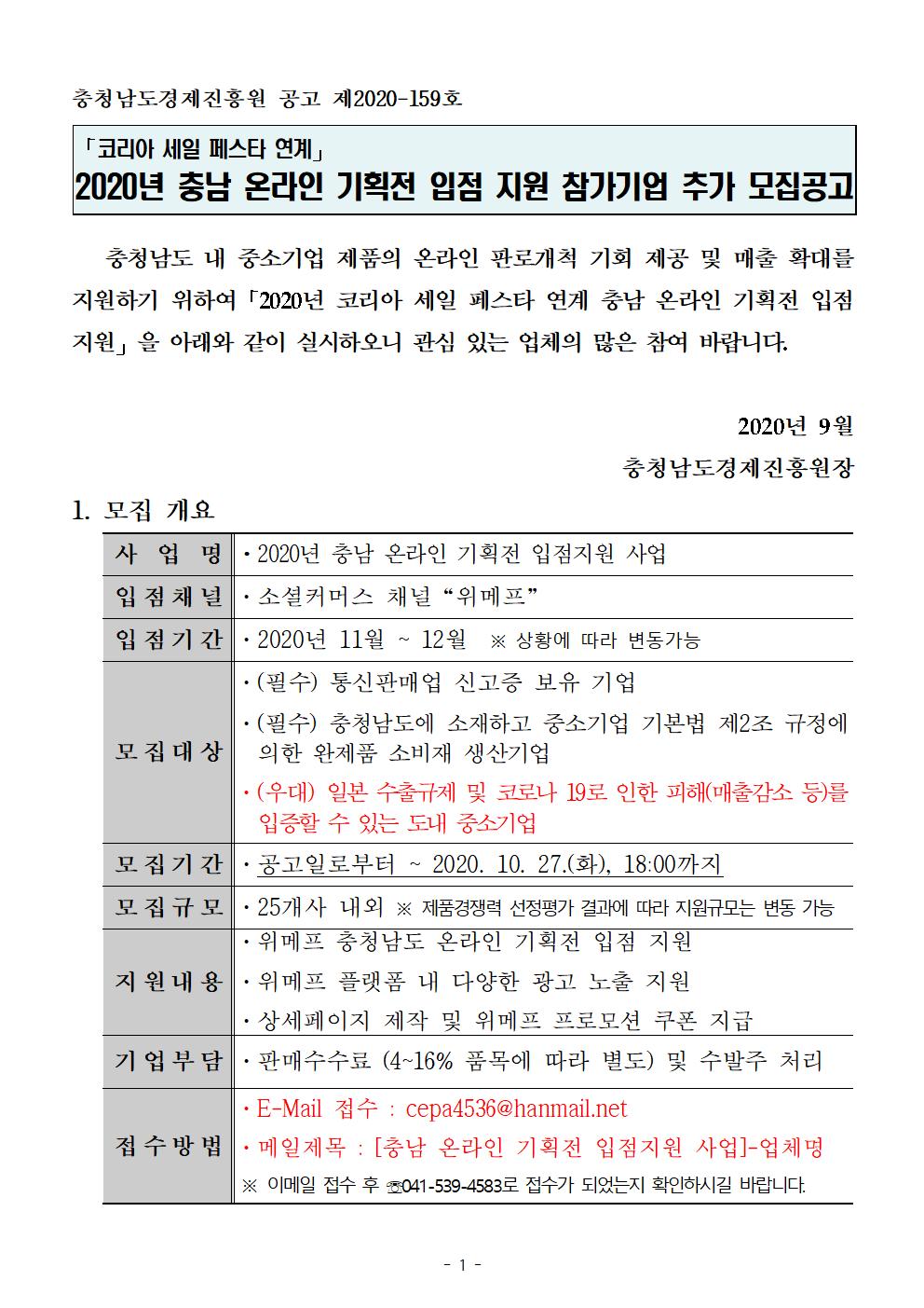 | 2020년 충남 온라인 기획전 입점지원 참가기업 2차 추가 모집공고 |