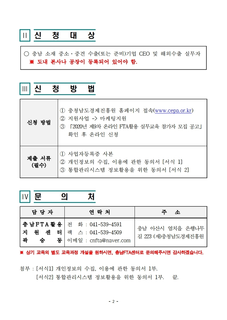 ▼ 2020년 제9차 온라인 FTA활용 실무교육 참가기업 모집 신청 링크 바로가기 ▼http://applycepa.com/bbs/write.php?bo_table=cepa66 |