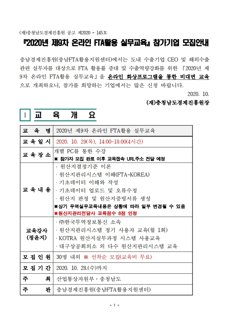| 2020년 제9차 온라인 FTA활용 실무교육 참가기업 모집 |
