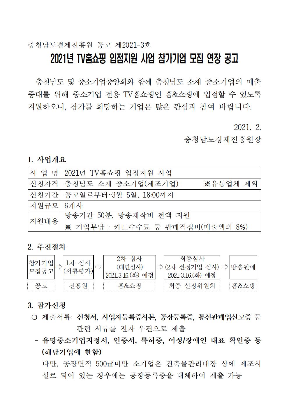 | 2021년 TV홈쇼핑(홈앤쇼핑) 입점지원 사업 참가기업 모집 연장 공고 |