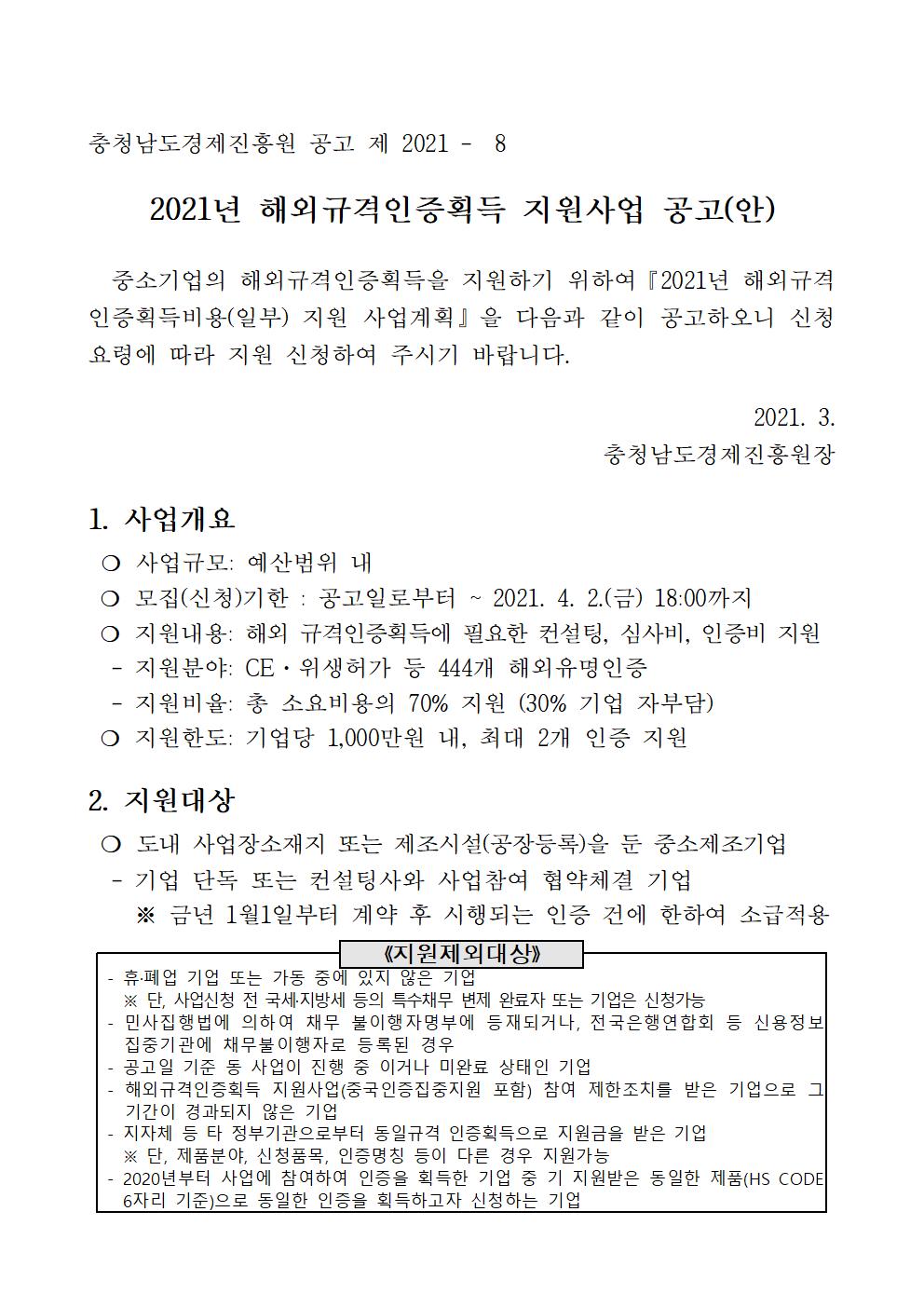 | 2021년 해외규격인증획득지원사업 참가기업 모집공고 |
