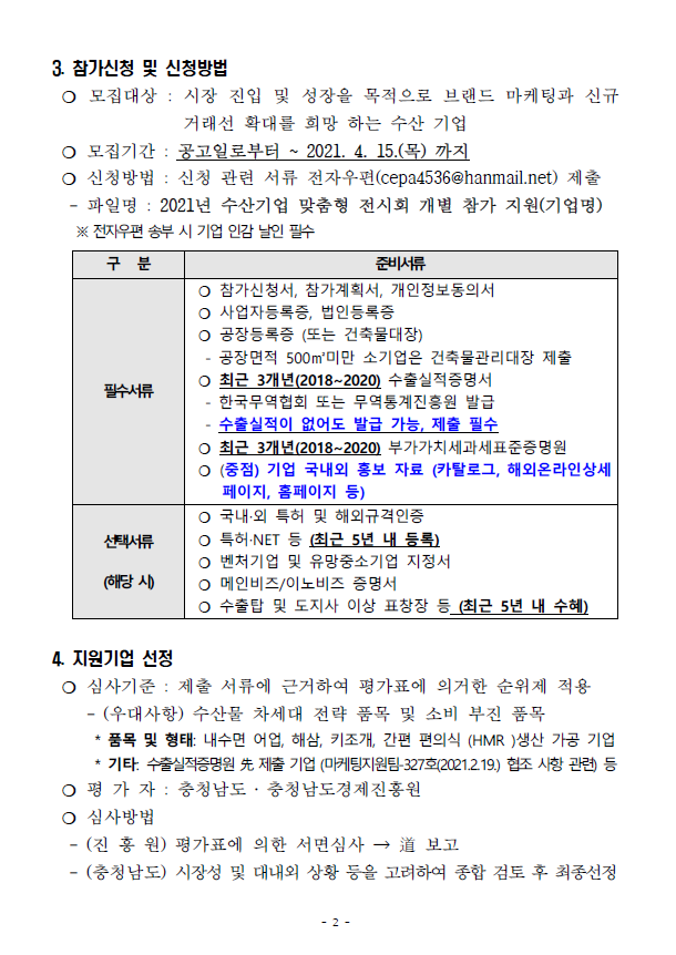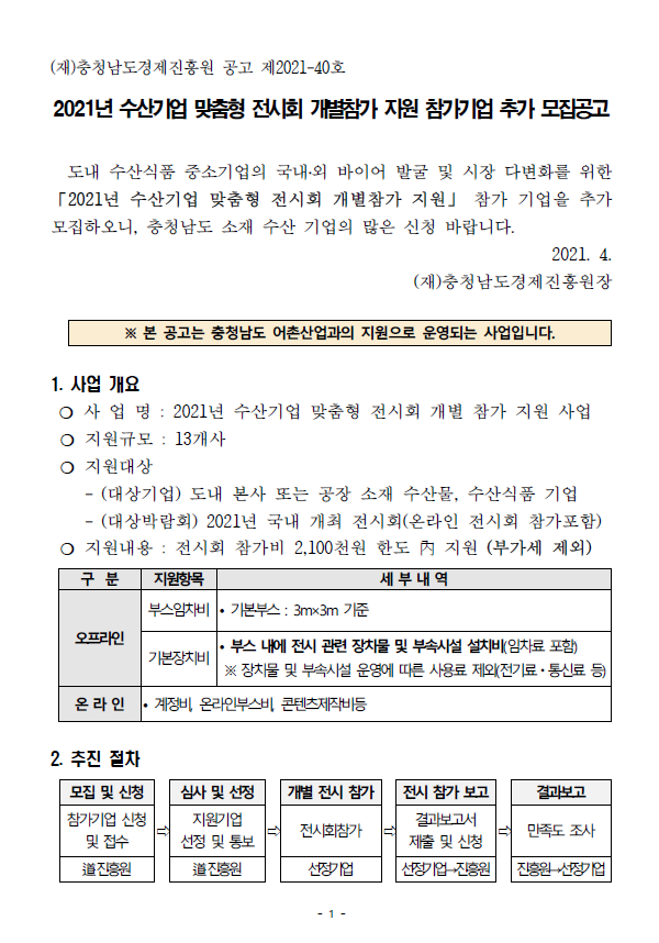 | [수산기업 대상] 2021년 수산식품 맞춤형 전시회 개별 참가 지원 사업 추가 모집 공고 |