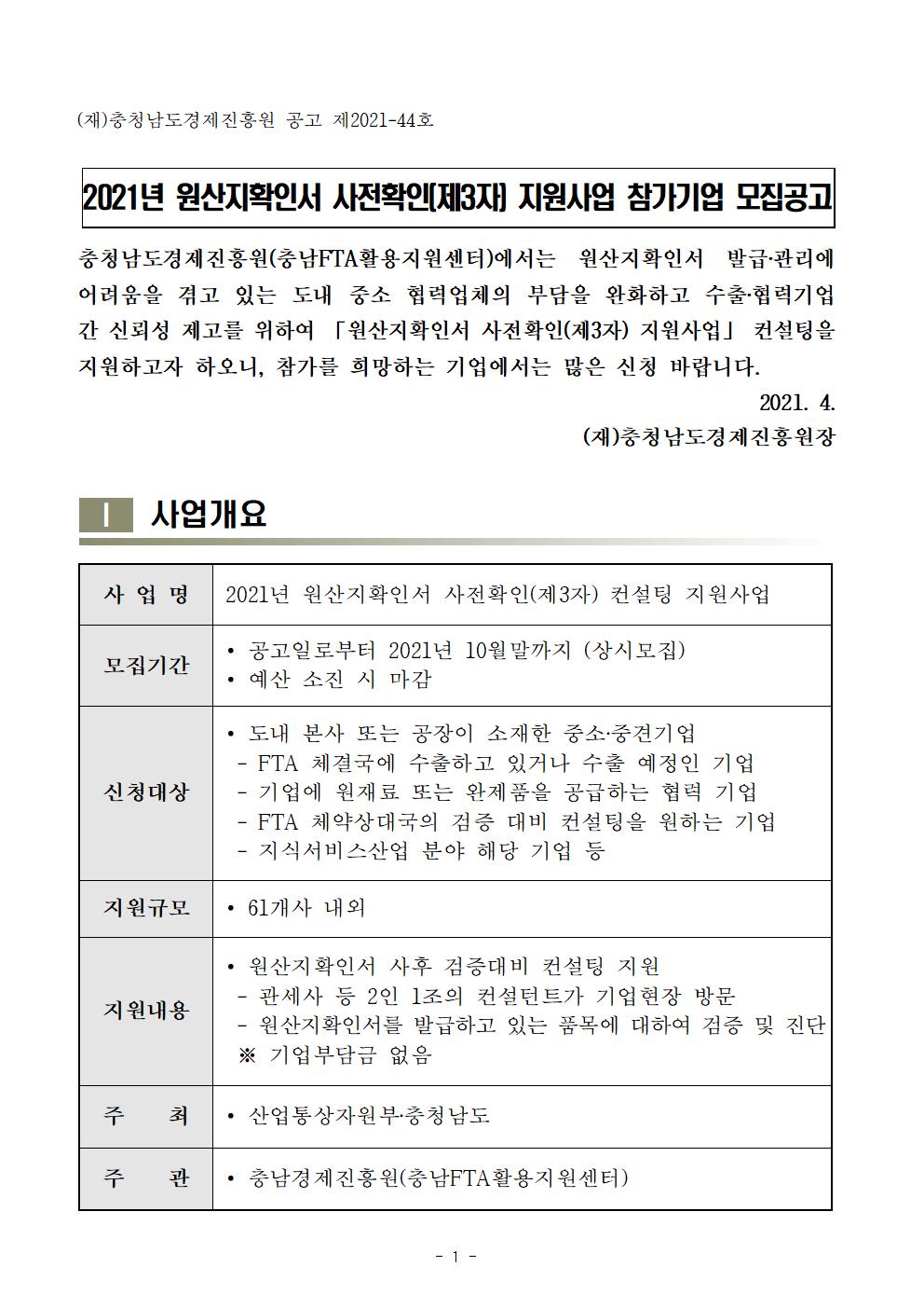 | [충남FTA활용지원센터] 원산지확인서 사전확인(3자) 컨설팅 지원사업 참가기업 모집 |