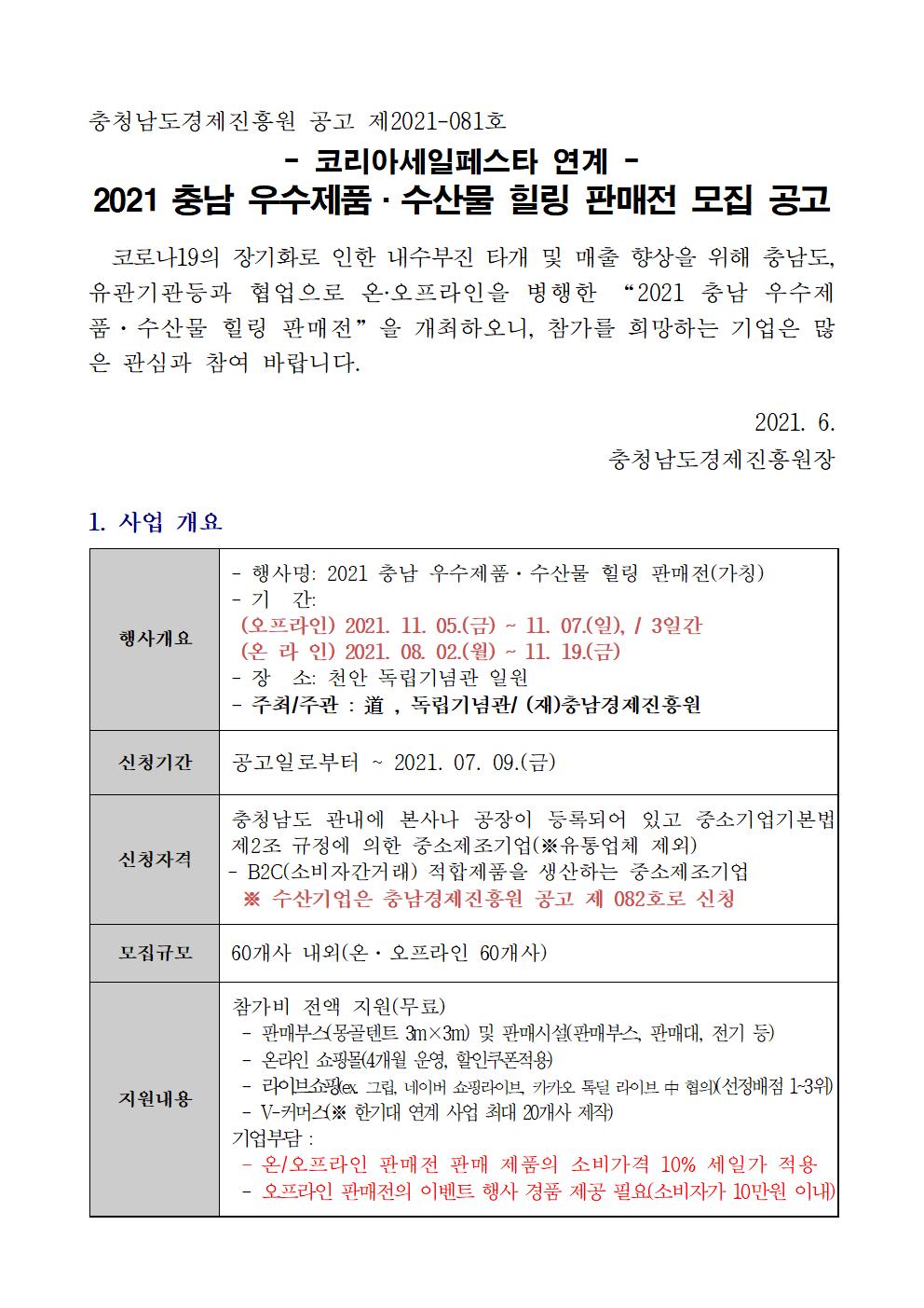 | [중소기업대상]2021년 충남 우수제품 수산물 힐링 판매전 참가기업 모집 공고 |