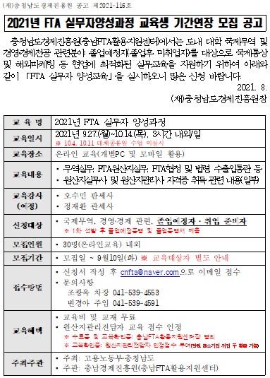 | 2021년 충남지역 혁신프로젝트 FTA 실무자 양성과정 교육생 기간연장 모집 공고 |