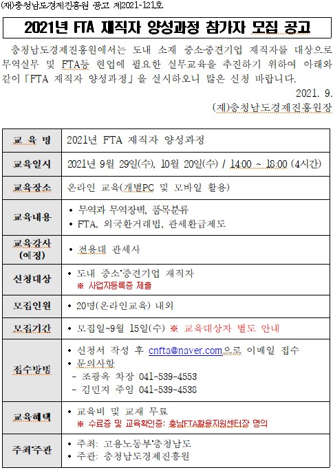 | 2021년 지역혁신프로젝트 FTA활용 재직자 역량강화 과정 모집 공고 |