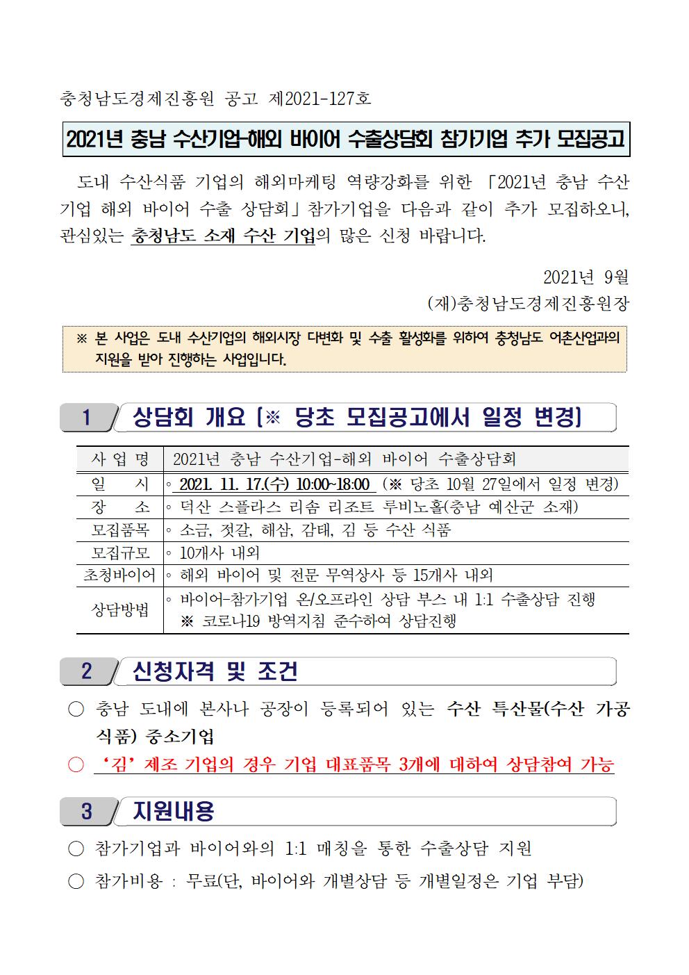 | [수산기업 대상] 2021년 충남 수산기업-해외 바이어 수출상담회 참가기업 추가 모집(행사 일정변경) |