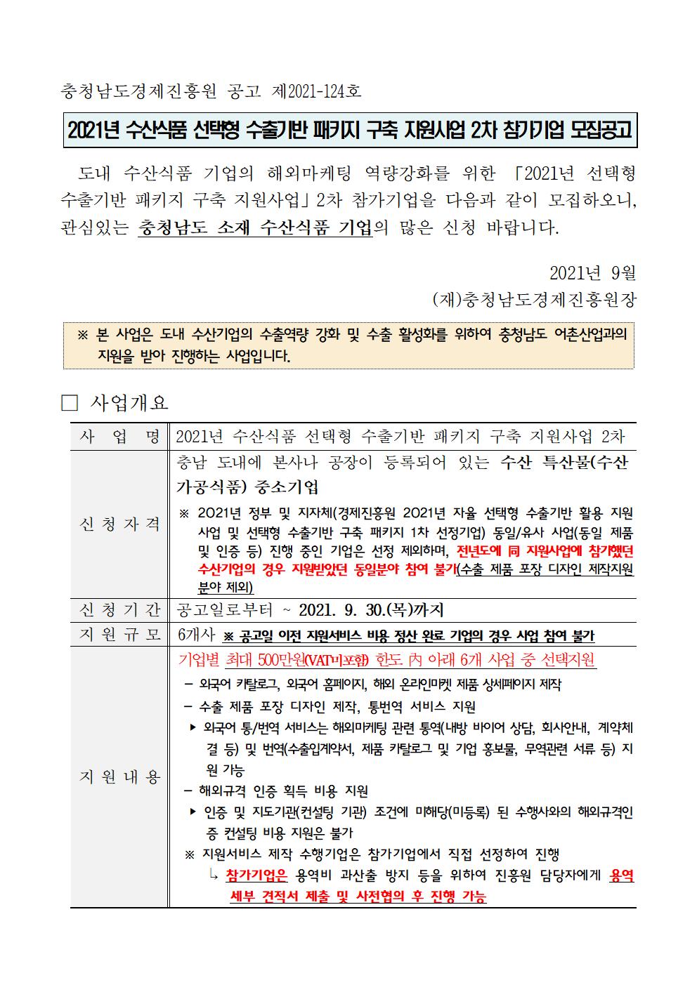| [수산기업 대상] 2021년 수산식품 선택형 수출기반 패키지 구축 지원사업 2차 참가기업 모집공고 |