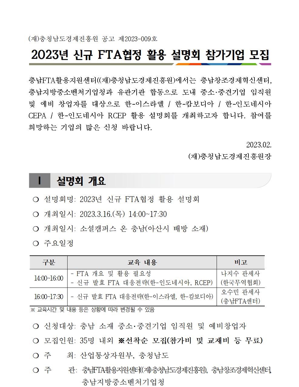 | 2023년 신규 FTA협정 활용 설명회 참가기업 모집 |