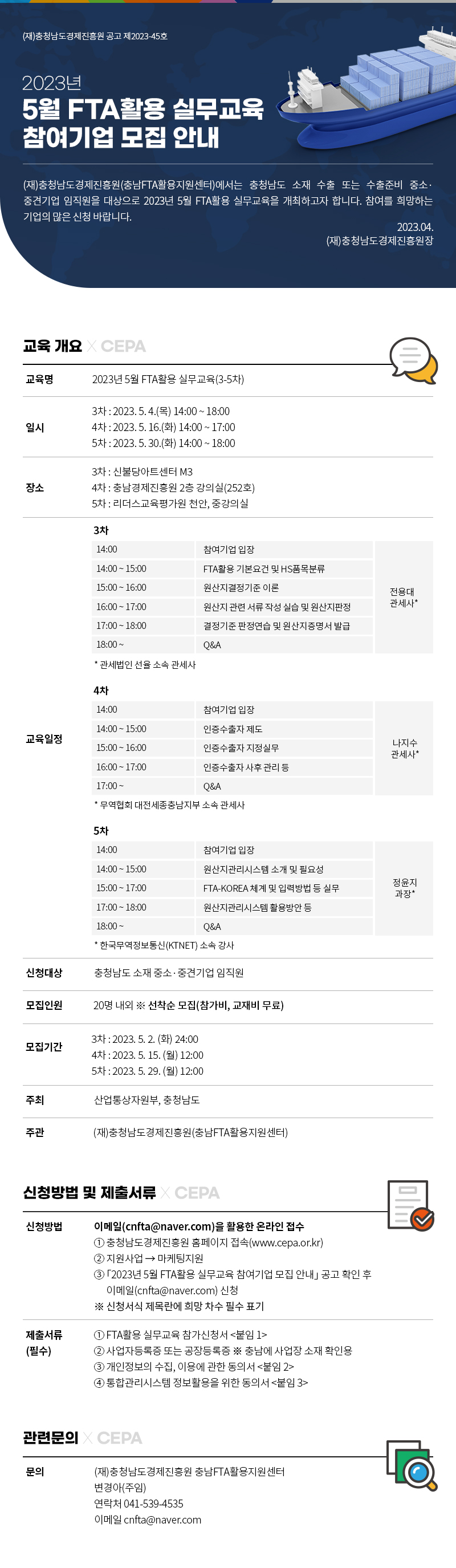 | [충남FTA통상진흥센터] 2023년 5월 FTA활용 실무교육 참가 모집 |
