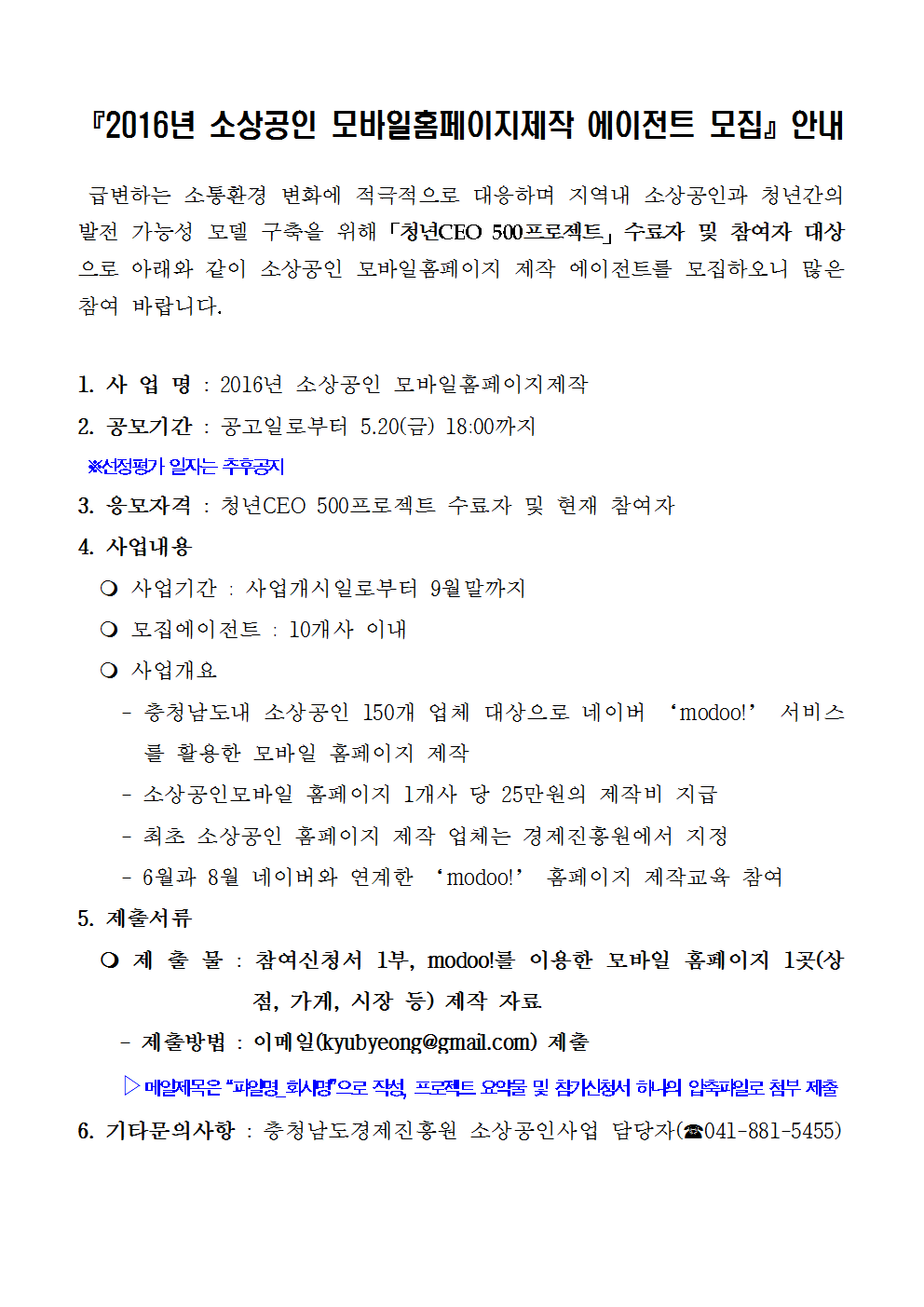 | 『2016년 소상공인 모바일홈페이지제작 에이전트 모집』안내 |