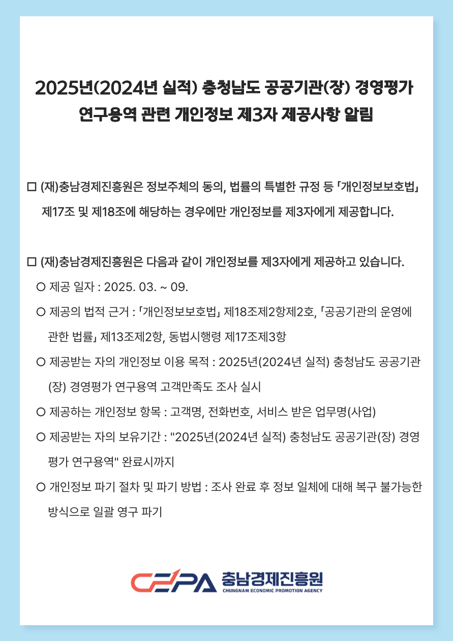 | 2025년(2024년 실적) 충청남도 공공기관(장) 경영평가 연구용역 관련 개인정보 제3자 제공사항 알림 |