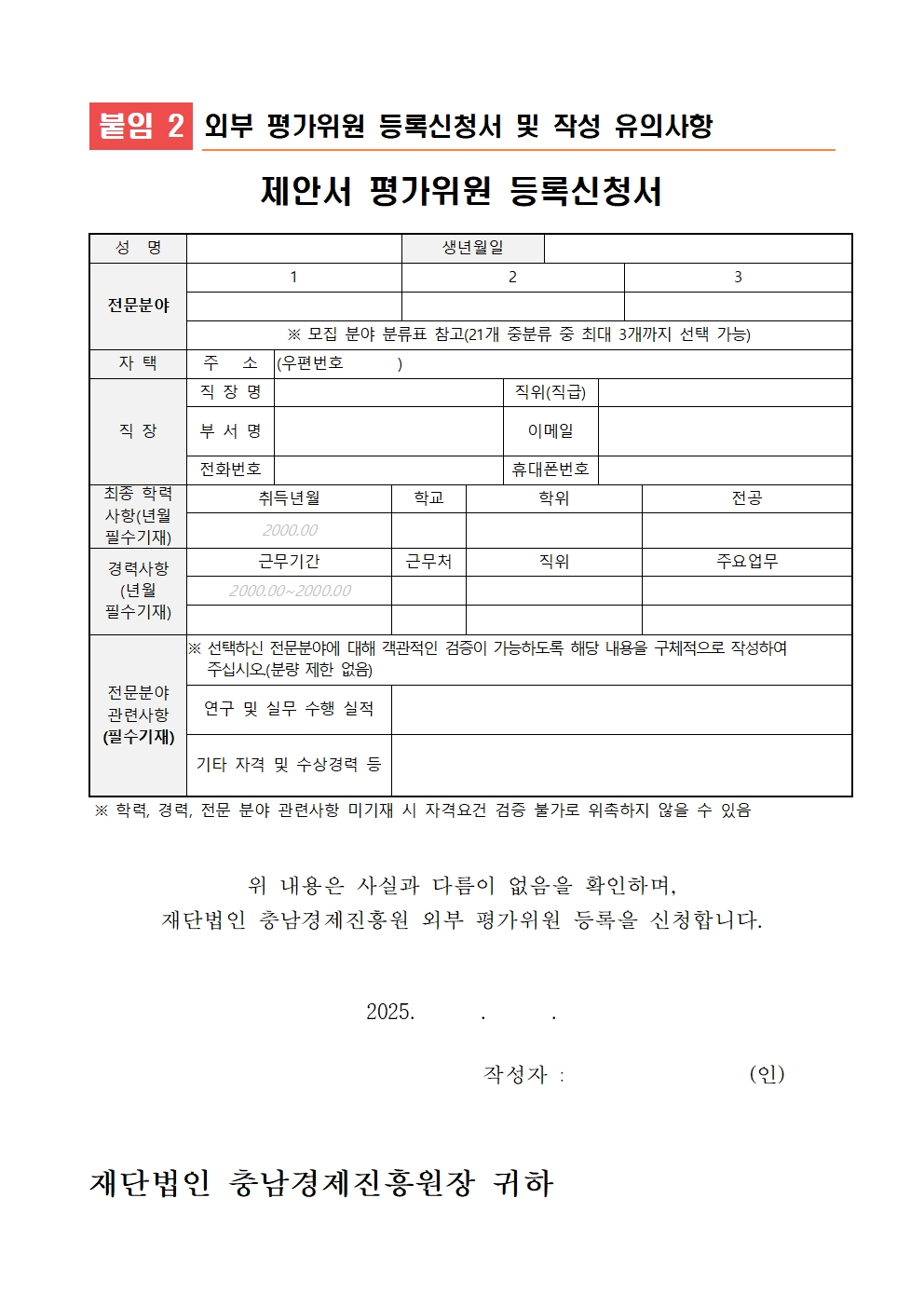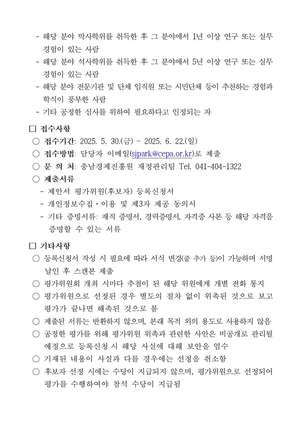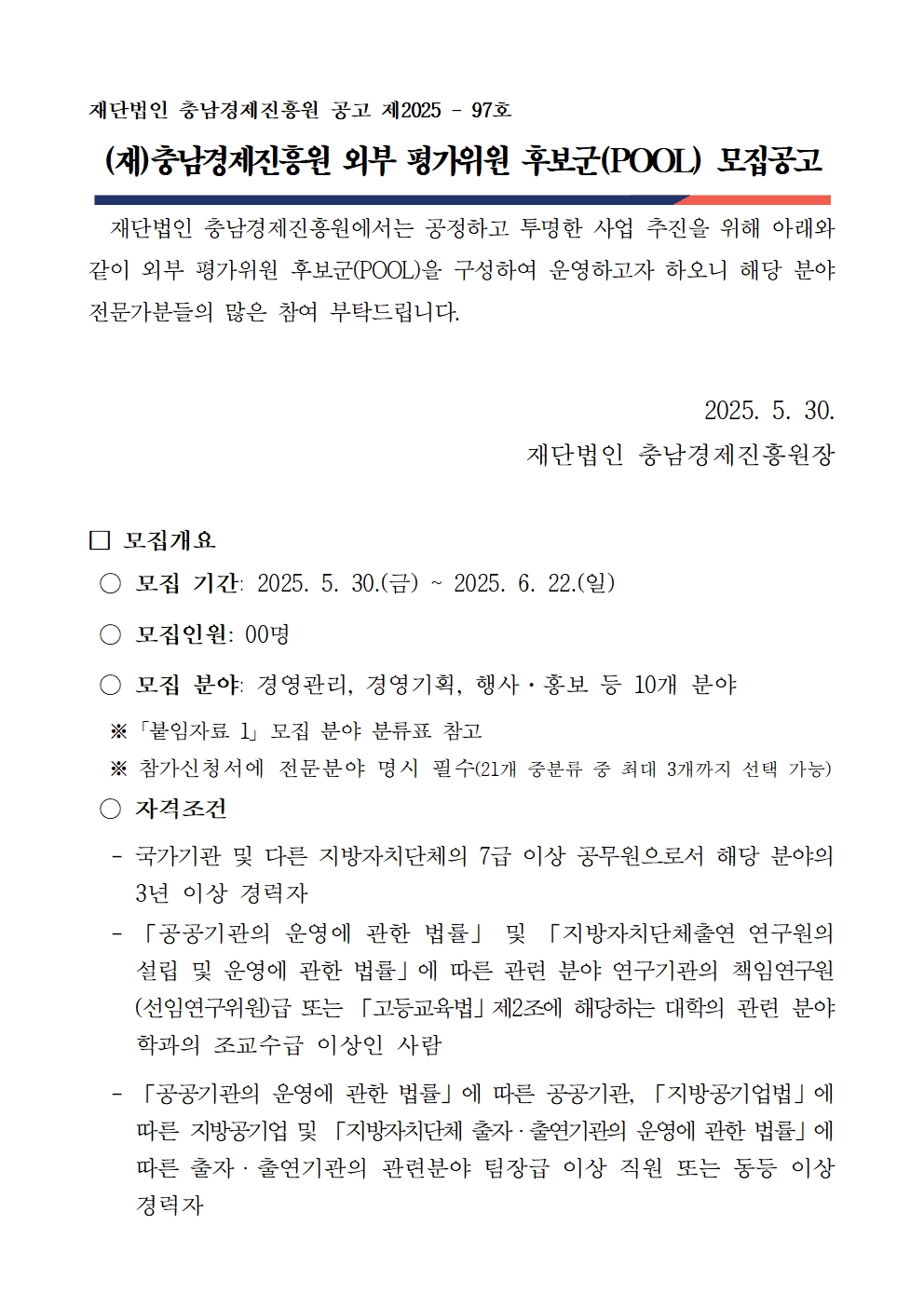 | 재단법인 충남경제진흥원 외부 평가위원 후보군(Pool) 모집 공고 |