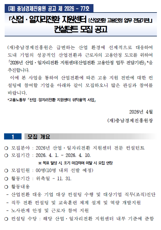 | 2026년 산업·일자리전환 지원센터 컨설턴트 모집공고 |