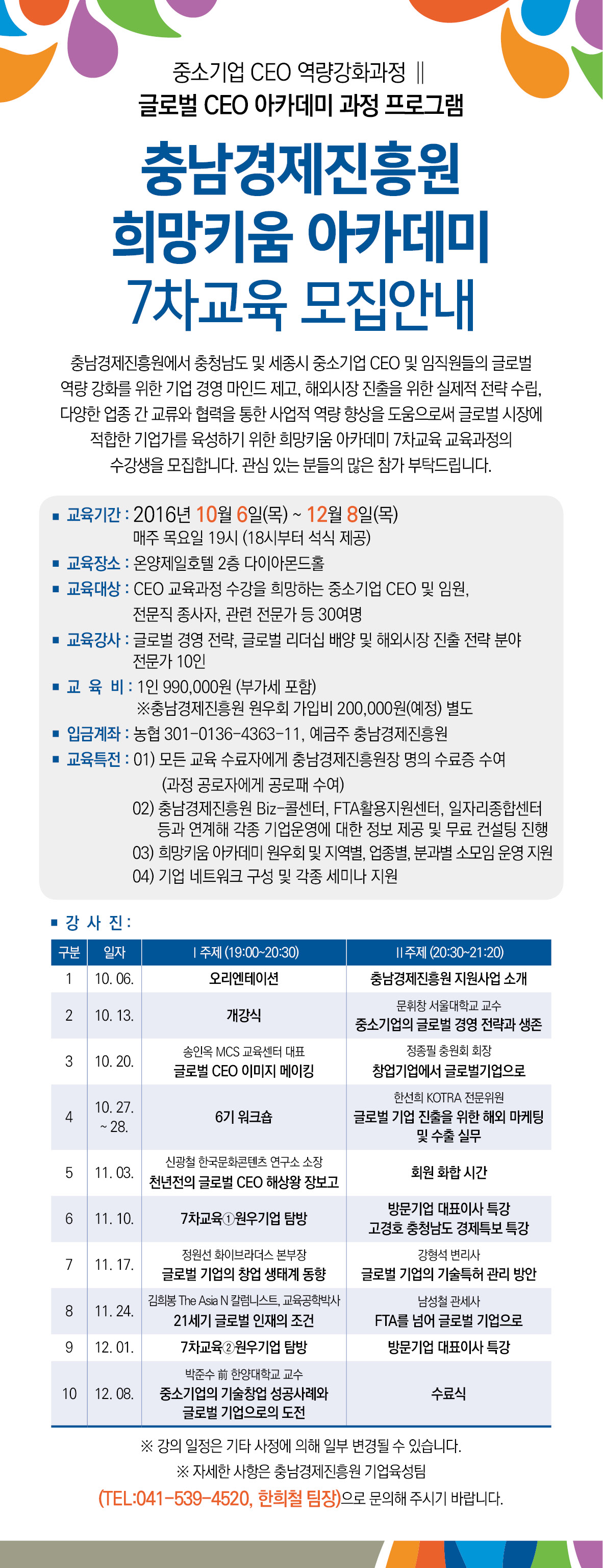 | 충남경제진흥원, 희망키움 아카데미 7차 "글로벌 CEO 아카데미 과정" 교육생 모집 안내 |