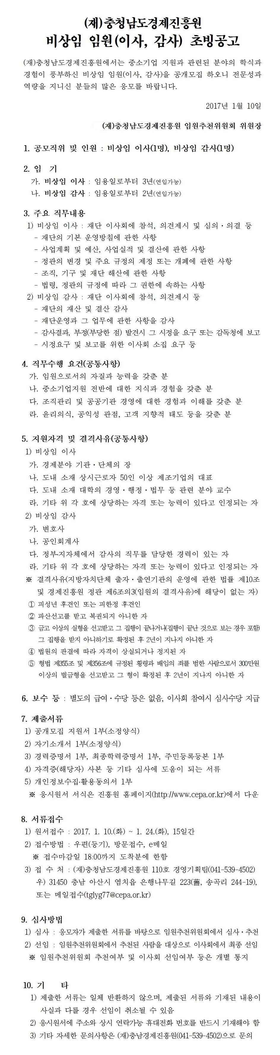 (재)충청남도경제진흥원 비상임 임원 초빙공고