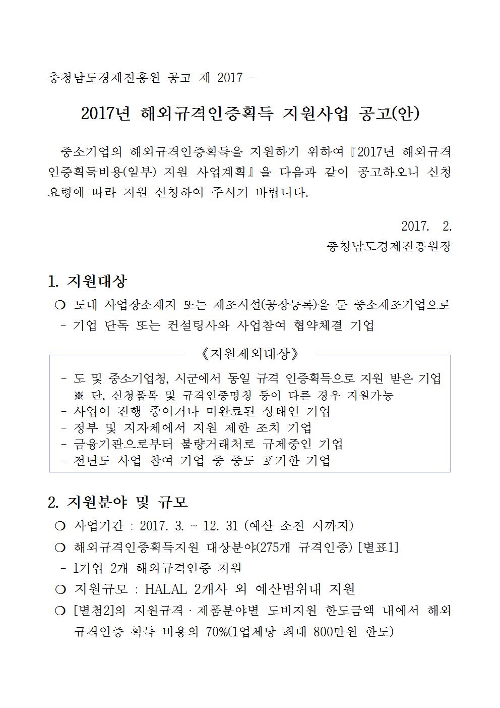 2017년 해외규격인증획득지원사업 참여기업 모집 공고의 건