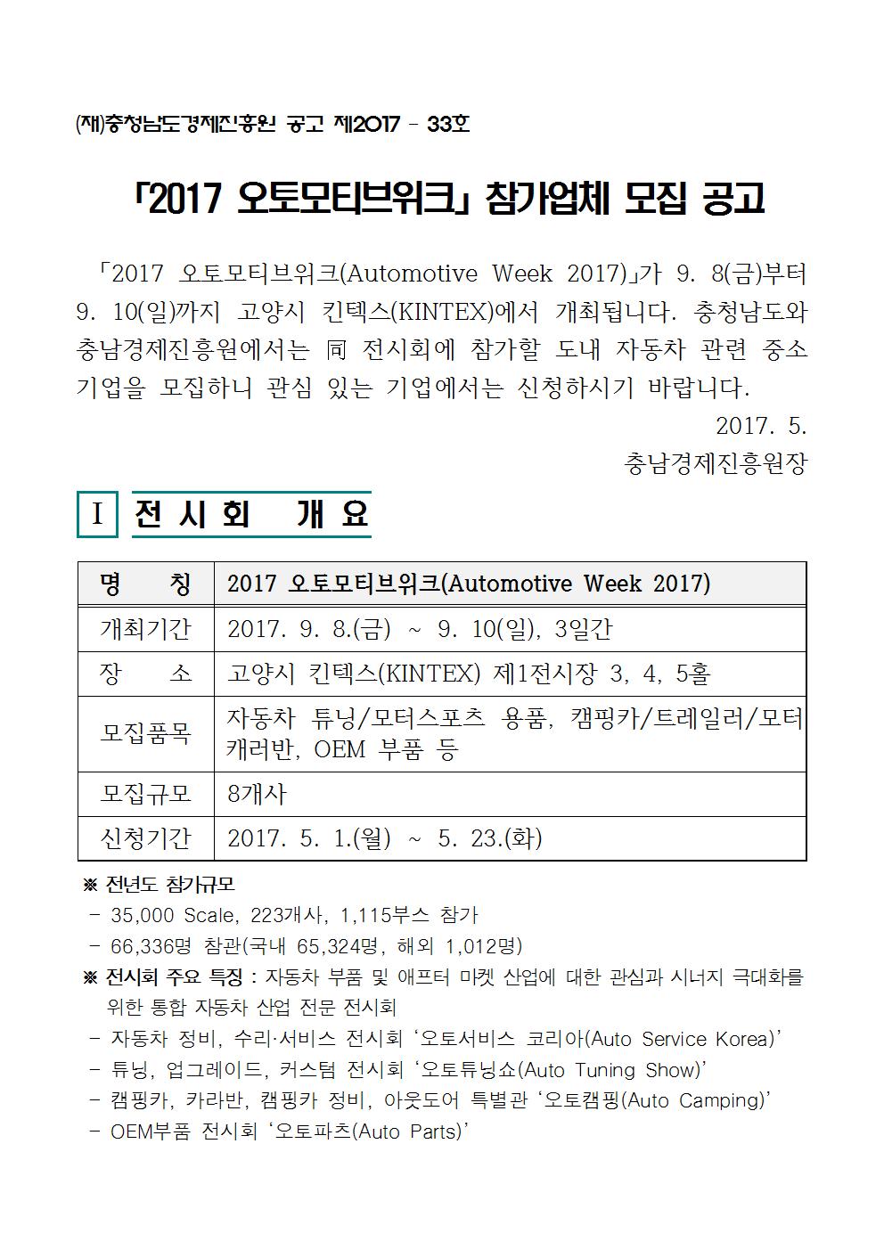 공고 2017 오토모티브위크 참가지원사업 참가기업 모집안내