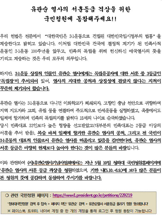 | 유관순 열사의 서훈등급 격상을 위한 국민청원 동참 |