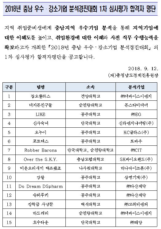 | 2018년 충남 우수강소기업 분석경진대회 1차 심사평가 합격자 명단 |