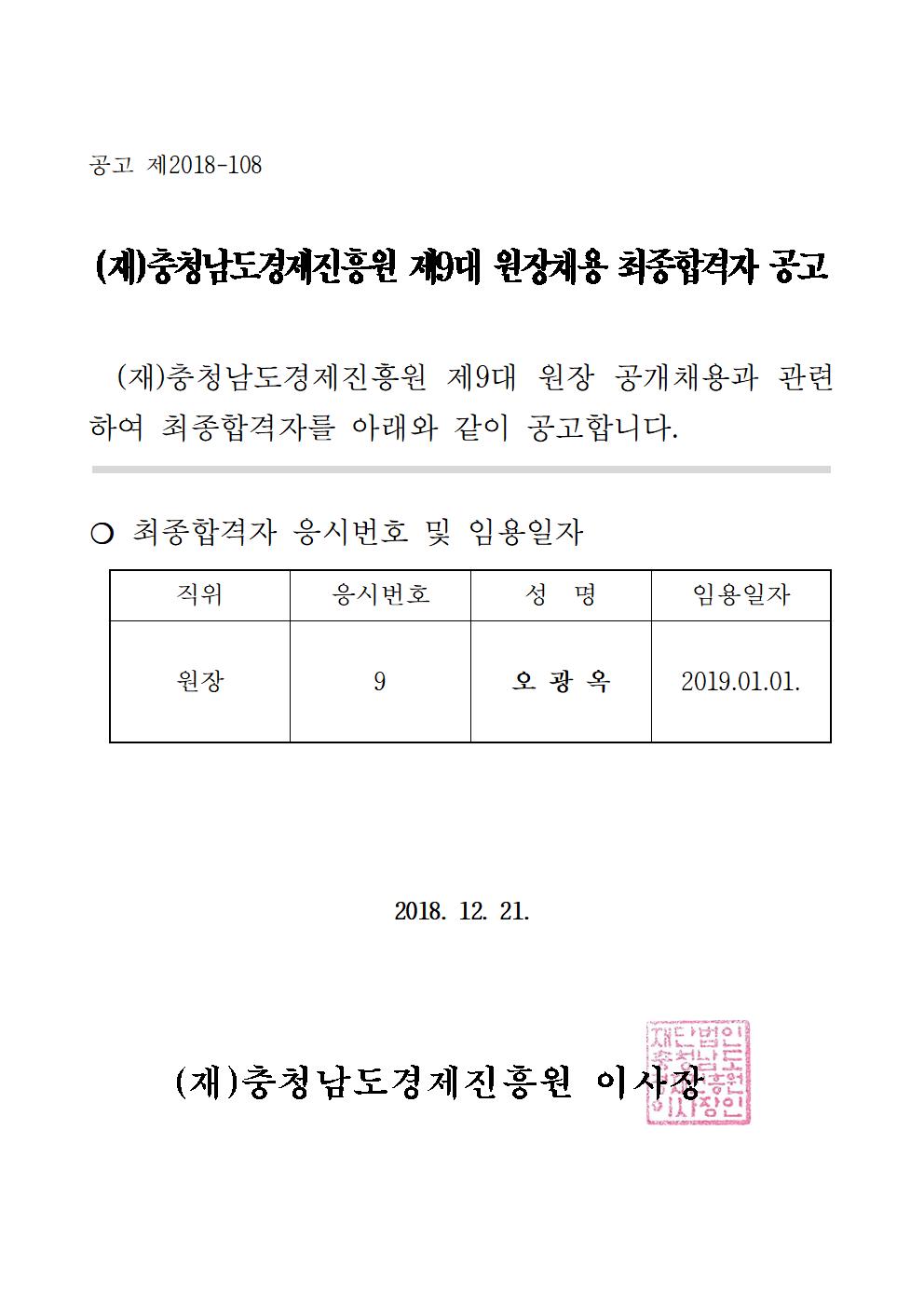 (재)충청남도경제진흥원 제9대 원장채용 최종합격자 공고