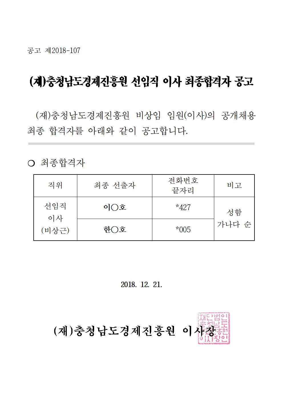 (재)충청남도경제진흥원 선임직 이사 채용공고 최종합격자 공고