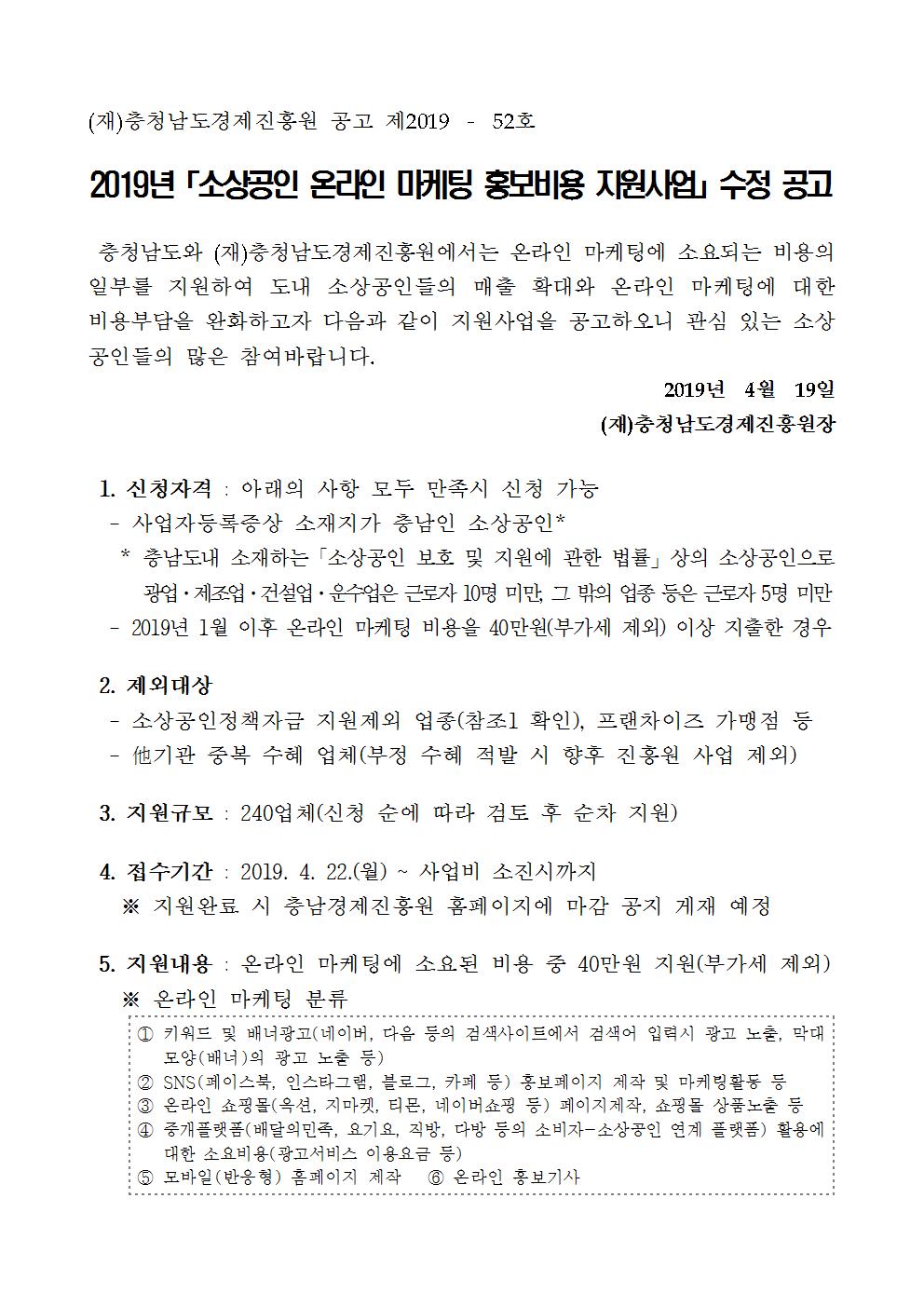 | 모집종료 2019년 소상공인 온라인 마케팅 홍보비용 지원사업 참여업체 모집 |