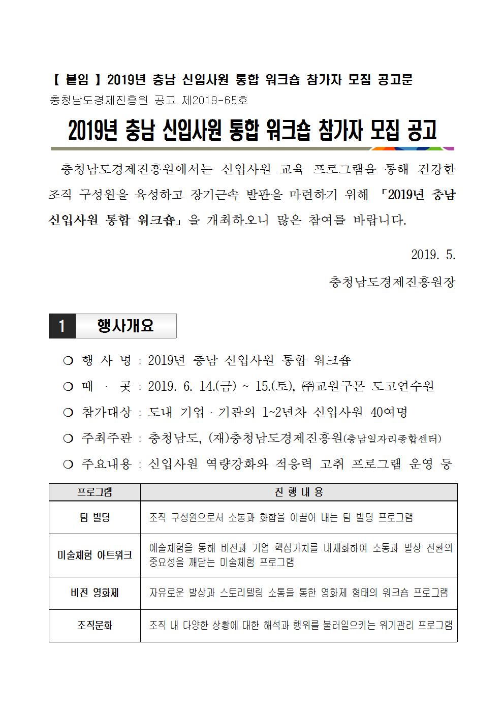 공고_2019년 충남 신입사원 통합 워크숍 모집_1.hwp