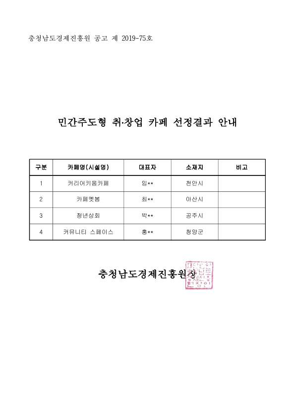 충청남도경제진흥원 공고 제 2019-75호 (민간주도형 취창업 카페 선정결과).pdf