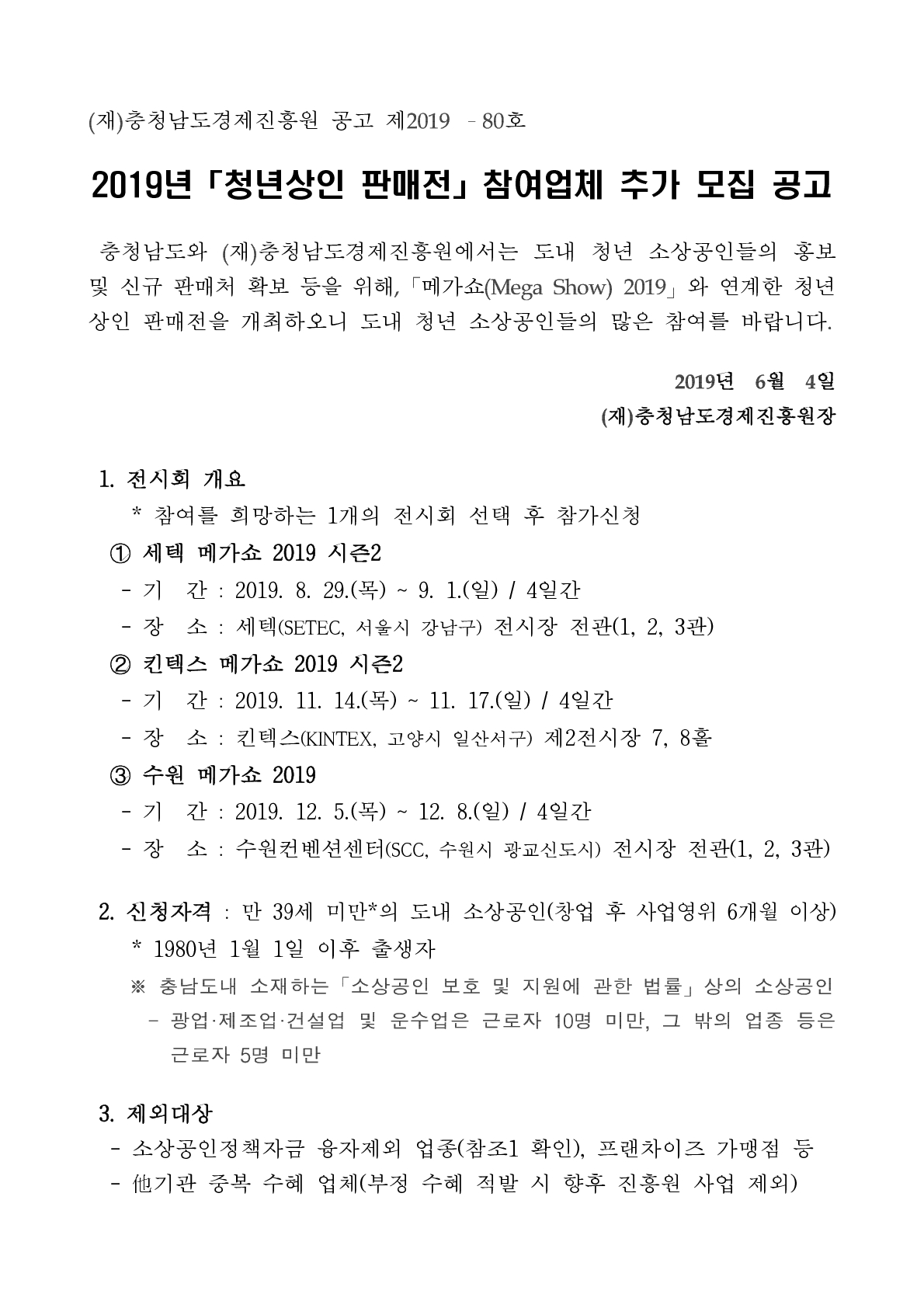 2019년 청년상인 판매전(메가쇼 단체참가) 참여업체 추가 모집