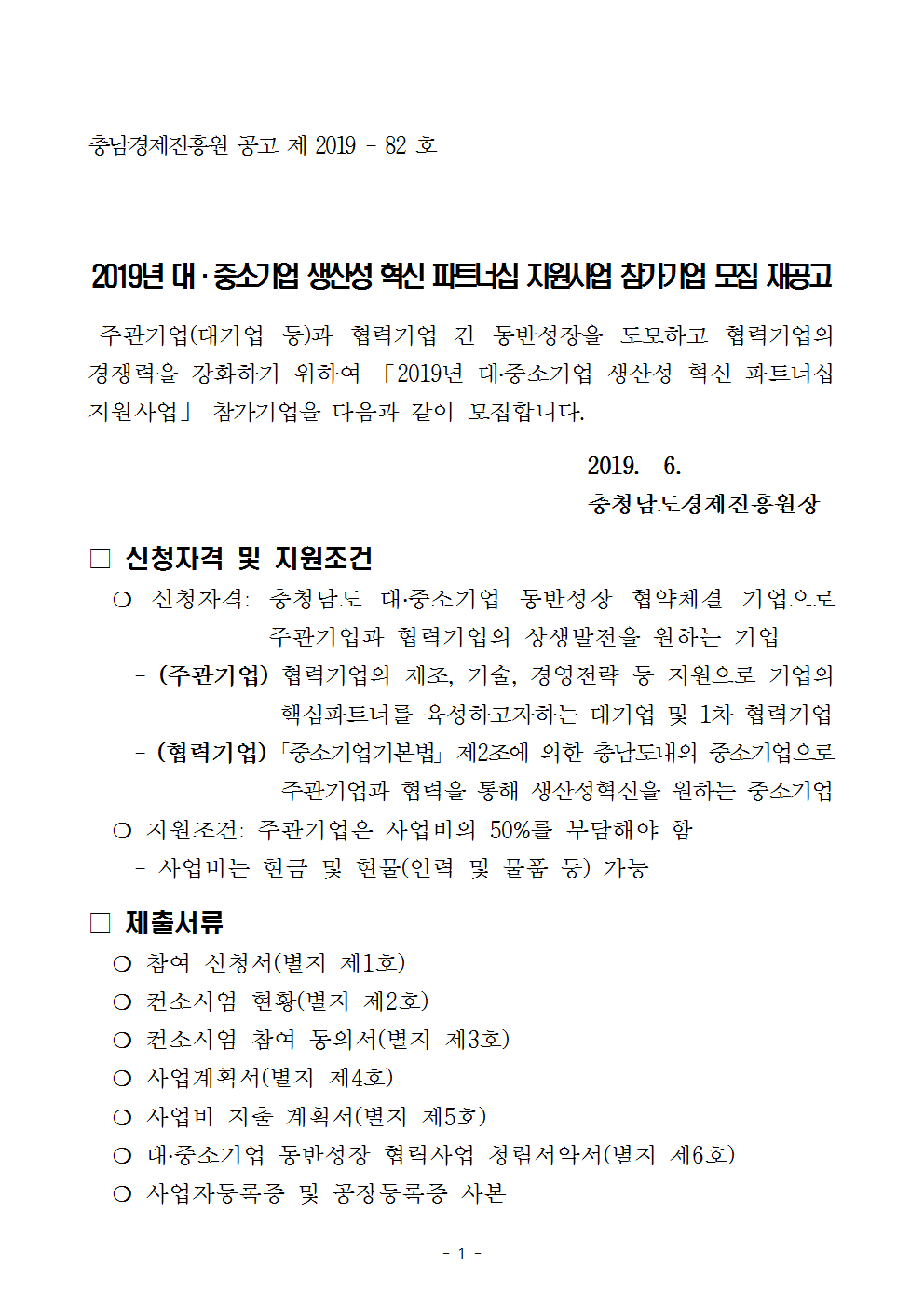 2019년 대·중소기업 생산성혁신 파트너십 지원사업 참가기업 모집 재공고