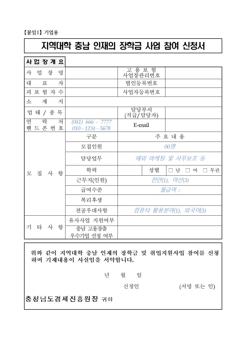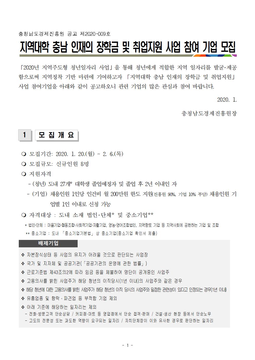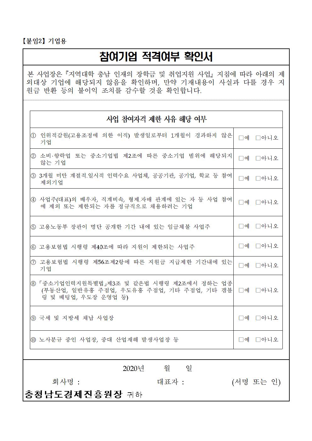 | 2020년 지역대학 충남 인재의 장학금 및 취업지원사업 참여기업 모집 |